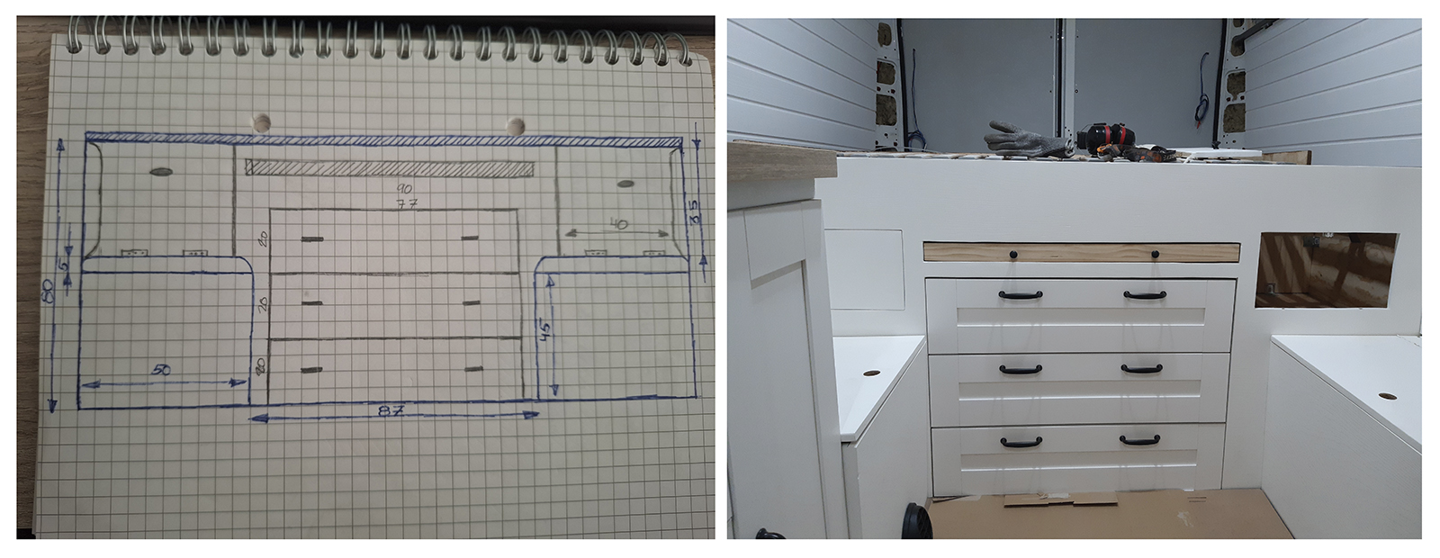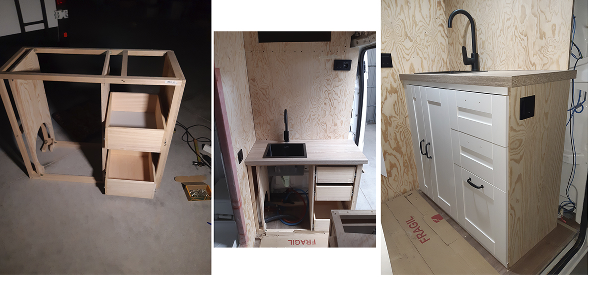 Para hacer los muebles y altillos y ahorraros algo de tiempo, además de conseguir un acabado más «profesional» os recomendamos comprar las puertas y frentes de los cajones en Ikea. Una vez que tengáis éstas empezar a construir el mueble y, no al revés, como hicimos nosotros, pues intentar adaptarlos a posteriori os complicará el trabajo.